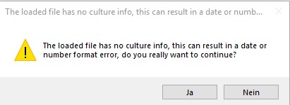 If the file does not contain a header with language information (these can be added to the export by checking the box "Include header in the exported file"), a message will be displayed that the file does not contain any culture info and ask you whether you want to continue anyway. Here, you simply click on Yes.