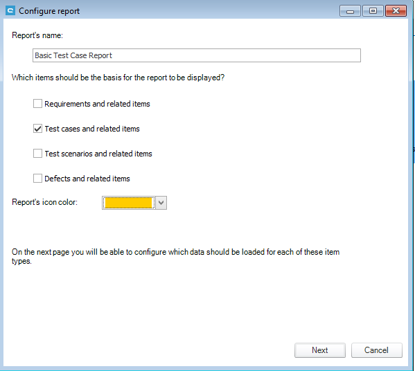 To create a new report, it is important to decide which data you want to use as a basis. You can decide to base your report on requirements, test cases, test scenarios, or defects. The layout designer will not be affected by your choice, only the information displayed after creating the report will be compromised. It makes sense to specify the required data basis as precise as possible in order to avoid loading too much data that is not required in your report.
