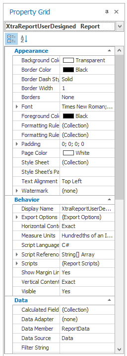 Every element in an aqua report has a set of properties that determine its appearance and the actions taken when the element fires an event. An event fired by an element can be “Before Print”, “After Print”, “Size Changed”, or “Text Changed”, for example. You can define a script function to be executed when such an event is fired. For example, on a “Before Print” event you can change the text of the label, which is useful when a label is printed within an iterating band. Changing the appearance of an element is straightforward. For example, the background colour can be set in the Appearance menu by the Background Colour parameter, or the font size can be changed by the size parameter within the Appearance – Font menu.