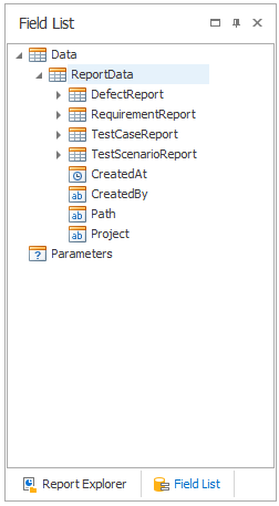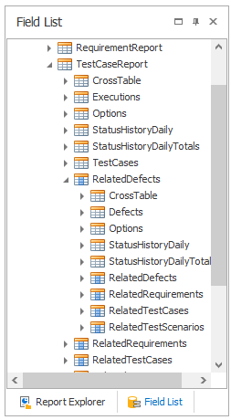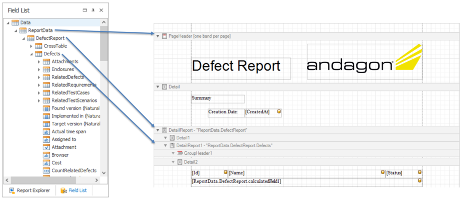 In the example below, we visually indicated how the field list elements are related to the report layout designer.