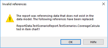The aqua report designer allows you to reference data fields in a lot of different places (report bands, charts, expressions which control styling or visibility, etc.). In some cases, it can happen that the report designer is not able to resolve such references anymore. One possible reason is that a calculated field has been renamed and the references to it in one or more charts were not updated. aqua will try to automatically remove such invalid references. In this case, you will see a warning like this: