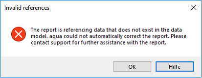 aqua has automatically removed the invalid references. Before you generate the report again, you should review the places mentioned in the error message and correct the references. In some rare cases, aqua might not be able to remove the references. In this case, you will see the following error message: