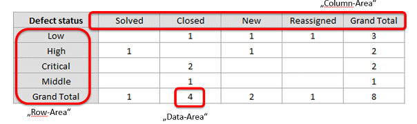 „Row-Area“ field that is configured on Significance shows all the element’s significances as rows. The „Column-Area“ field that is configured on Status shows all statuses as columns, and „Data-Area“ field is configured on the number of elements shows the corresponding number of elements from the significance-status-pairs