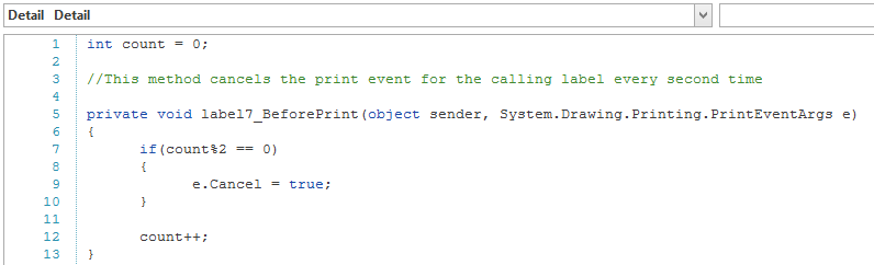 Here, you can add some functionality to your report. For example, if you only want to print a label every second time, you can add the following code: