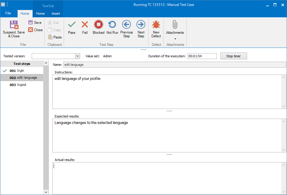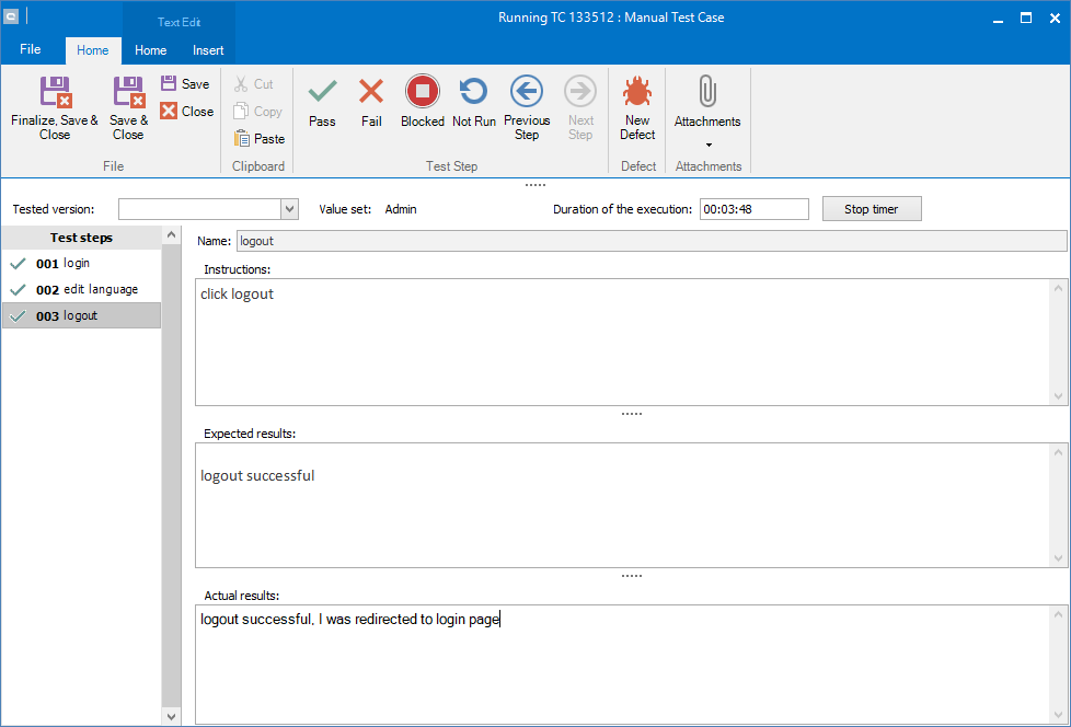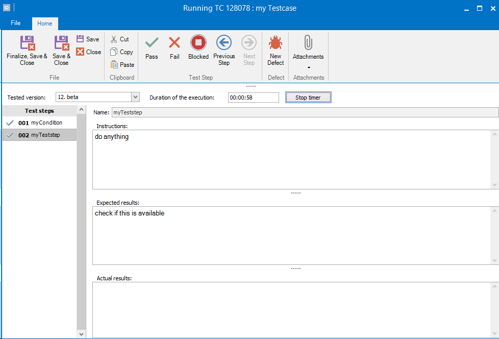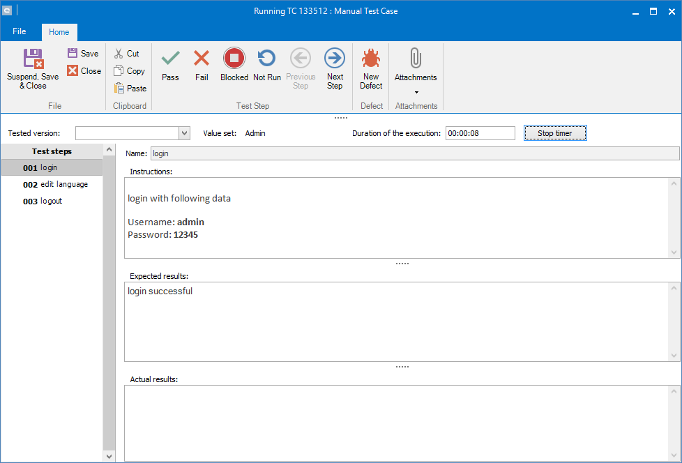 The second step is a test step. Here we find an Instruction and Expected results. Moreover, we find an extra field Actual results, where we can document the result we receive while executing. We are documenting the result as the following: