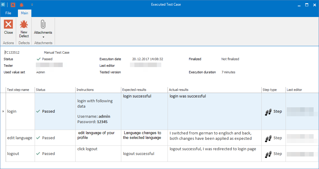 The test execution is continued, enabling you to change all information. Furthermore, the identity of the last test step editor is saved. If a manual test case is executed, you can finalize the test execution. This means that from this point onwards, test cases can no longer be continued or changed.