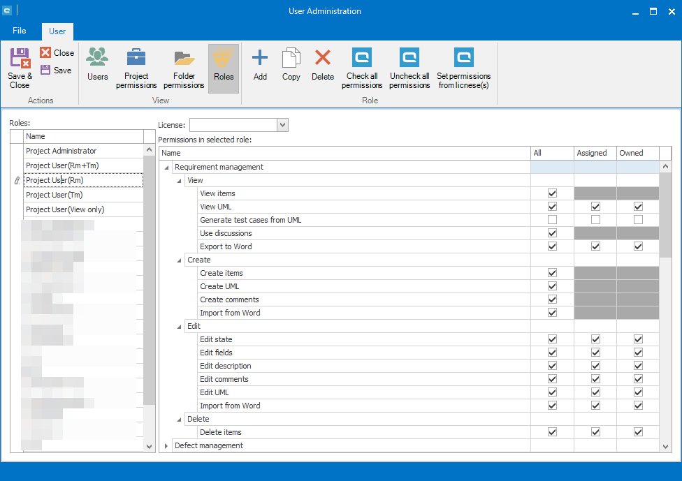 In User Administration, you can define individual roles that customize the rights of your groups of users. Later, the role can be assigned to a specific user in a specific project in the Project Permissions view. The predefined roles are Project Administrator, Project User (Rm+Tm), Project User (Rm), Project User (Tm), Project User (View only) and Project Assignment.