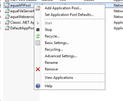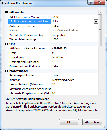 Now we have to disable 32-Bit Applications in IIS. For that we open the IIS, open context-menu on aquaAPIPool and select Set Application Pool Defaults. Here we set Enable 32-Bit Applications on False.