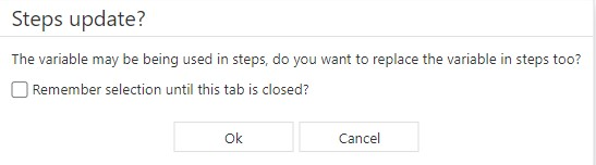 As soon as you make changes to the variable names, you will be asked whether the variables should be updated in the test steps in which they are used. If you confirm with Ok, the variable names are updated in the steps. If you click Cancel, the variable names in the steps are not replaced and will not be printed in future test executions.