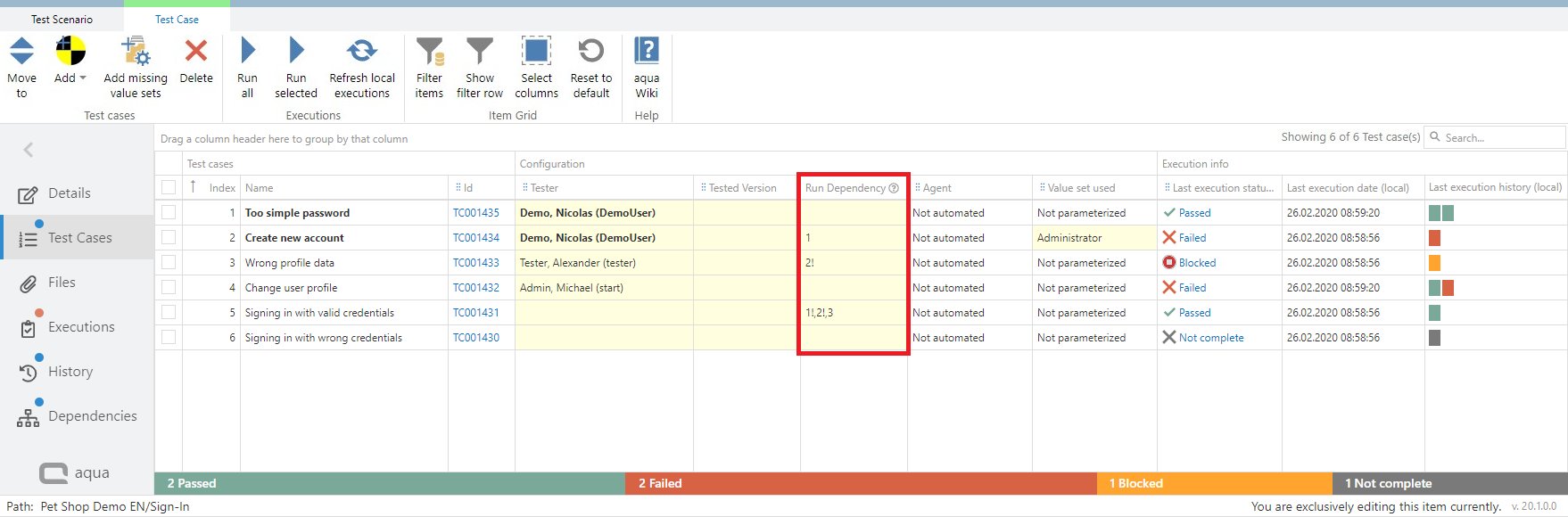 After your test cases are added to the test scenario you can define a run dependency between them. This is useful, for instance, if a test case must pass before the next one can be executed. This means that if a single Test Case fails, none of the other Test Cases should be executed. To do this, add values to the Run Dependency column in the Test Cases view within a test scenario.