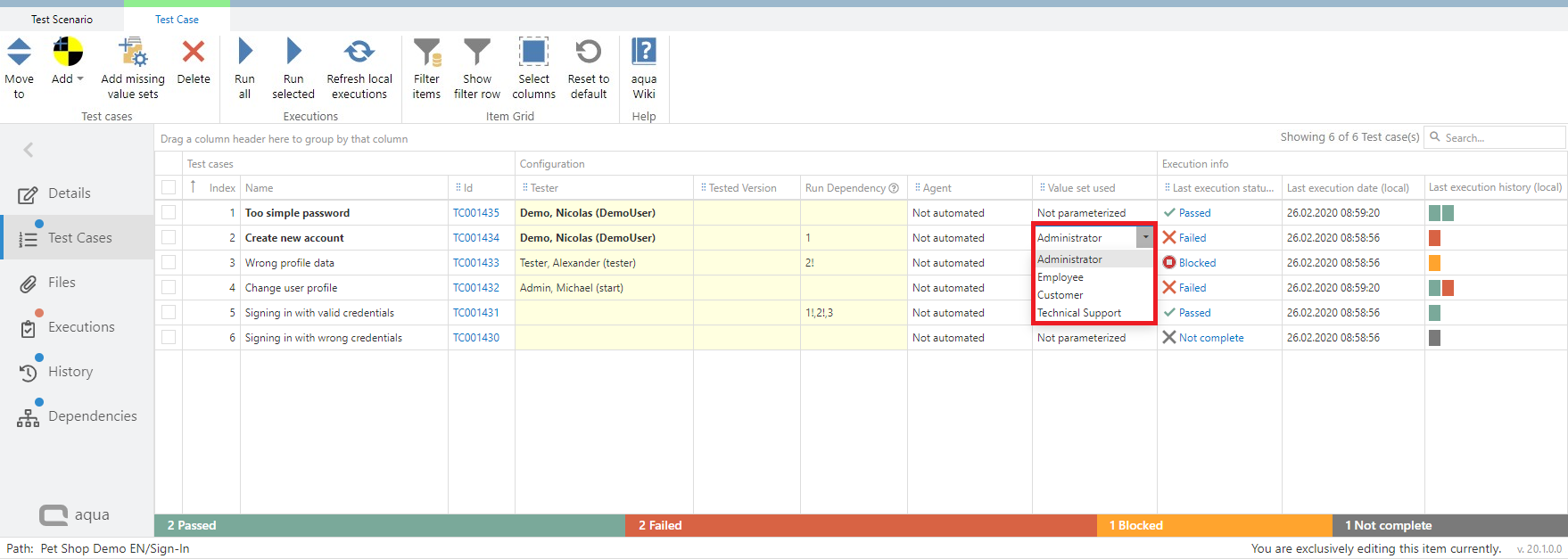 When a test case is parametrized, the default value set is automatically entered. You can also select one of the other value sets of the test case in the Value set column.