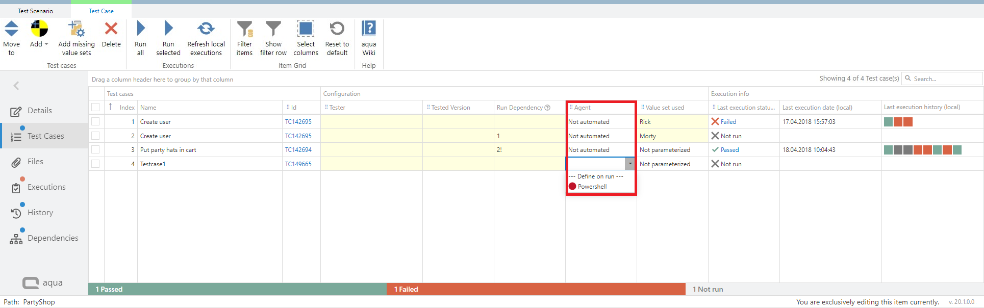 To define agents, click on 'Test Cases'. Here you will find an 'Agent' column. When you click in the cell where you want to define an agent, a drop-down list appears from which you can select the agent. The agent defined in the scenario is always considered first.