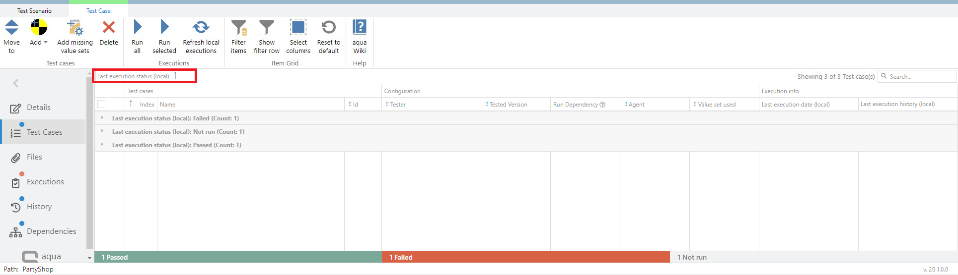 Efficiently locate the test cases you need with a customizable view that allows you to sort, group, and filter by any column, just like you're used to from the item grid. For even faster navigation, drag and drop columns to group them by your preference. Additionally, the search bar in the top right corner enables text-based search and filtering across multiple columns, including Name, ID, Tester, Tested Version, Run Dependency, Agent, Value set used, and Last execution status. This comprehensive search functionality empowers you to quickly identify and locate the specific test cases that matter.