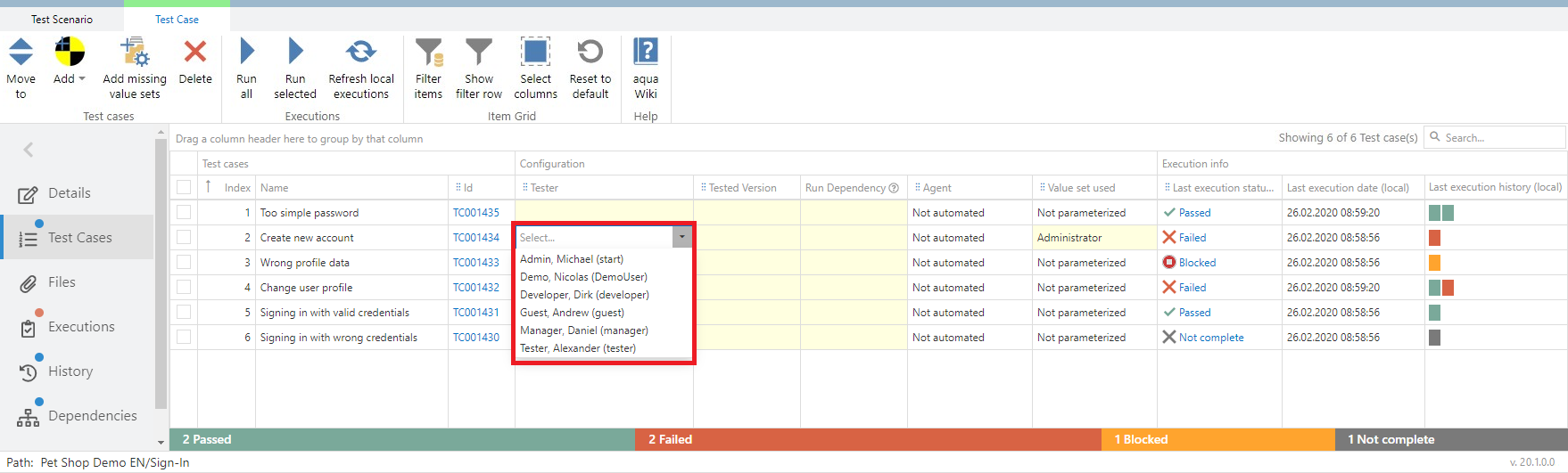 You can assign a tester to each test case in the context of the scenario. Note that you cannot overwrite the assigner from the test case. To assign a tester to a test case in the scenario, click on the empty cell under the 'Tester' column. A drop-down list will appear from which you can select a colleague assigned to the current project. If the selected tester is the current user, the name is displayed in bold.