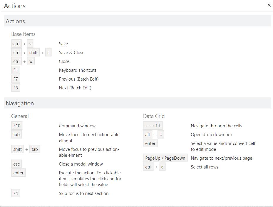 One very important accessibility criterion is the ability to use an application with a keyboard. For this purpose, the tab and arrow keys can be used to navigate through the aqua interface. To make this as efficient as possible for people who are completely keyboard dependent, additional areas have been defined that can be accessed directly without having to navigate through them. You can quickly switch between these different areas using the F4 key, and then use the Tab key to move to different positions within that area. There are also a few more keyboard shortcuts, as described above, as well as a command line for quick navigation and editing using the keyboard.